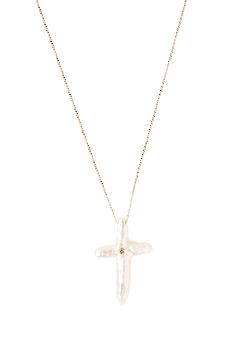 14k gold necklace featuring a white baroque pearl cross and a champagne diamond. Fastens with spring ring closure and extender chain. Baroque pearls are unique and one of a kind so sizes and shapes will vary. Online exclusive.