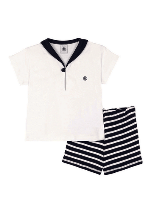Introduce your little one to the world of style with this Petit Bateau White and Navy Baby Sailor Collar Top and Stripe Shorts Set.