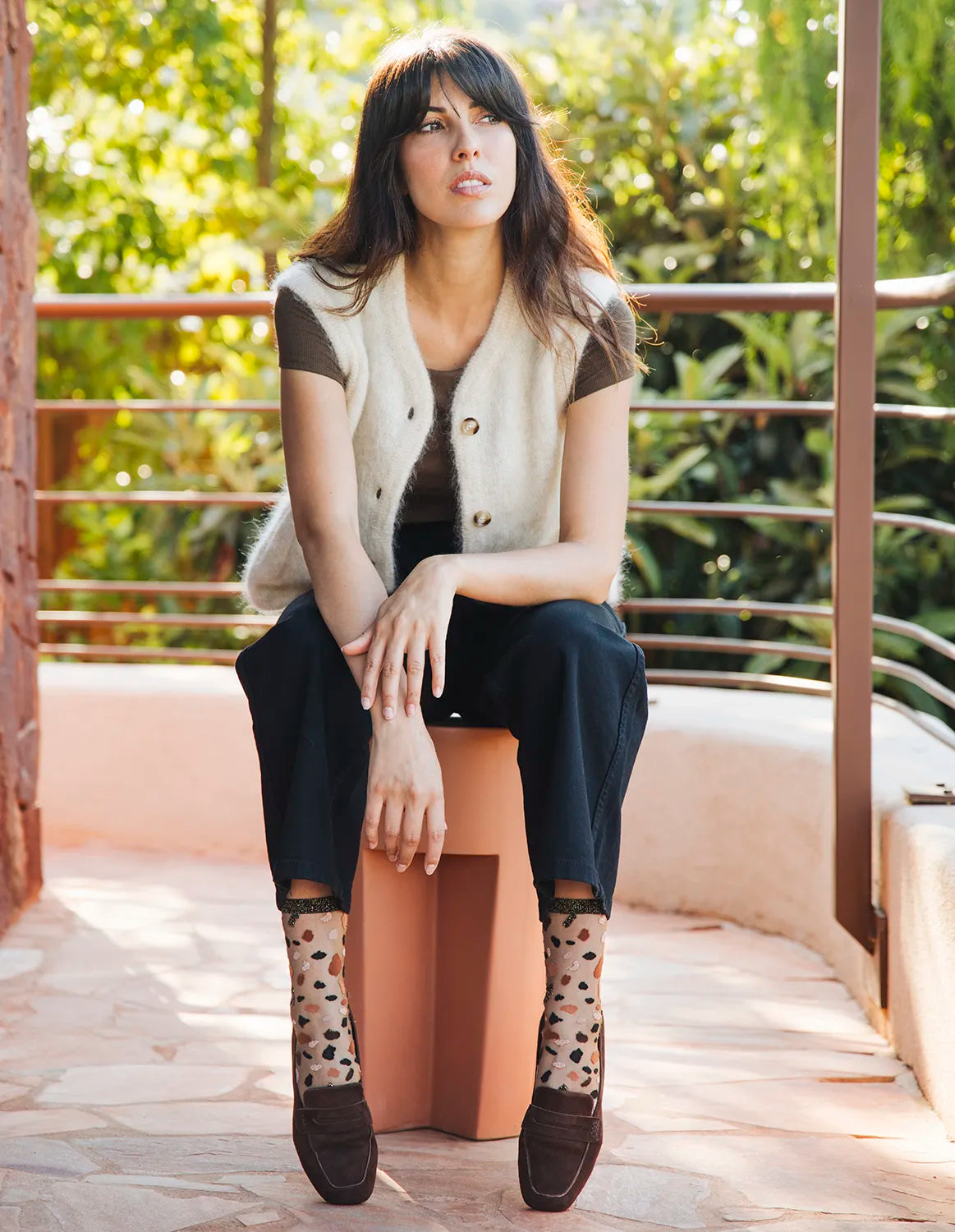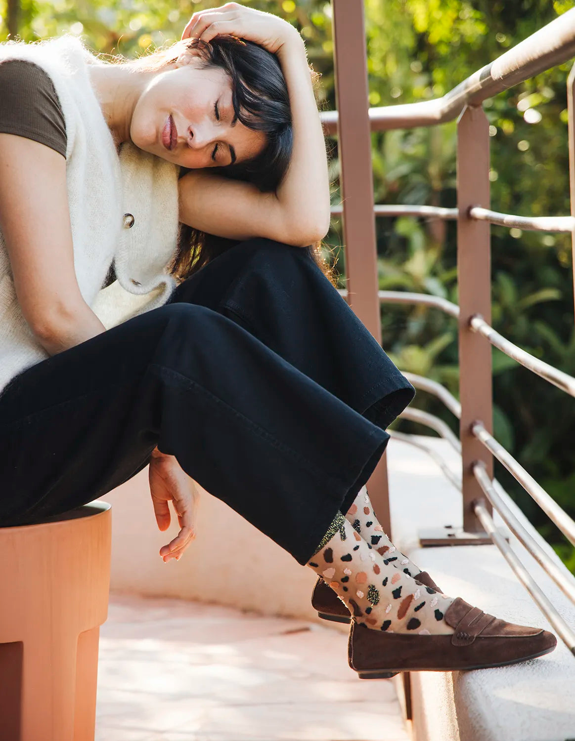 Crescent Dunes Black , a timeless classic. This sober and elegant model is inspired by the solar panels tracking the sun in the heart of Nevada. A sock with black and white polka dots that delicately hug your ankle. Full of chic, it will go wonderfully with loafers and a skirt or black carrot pants.