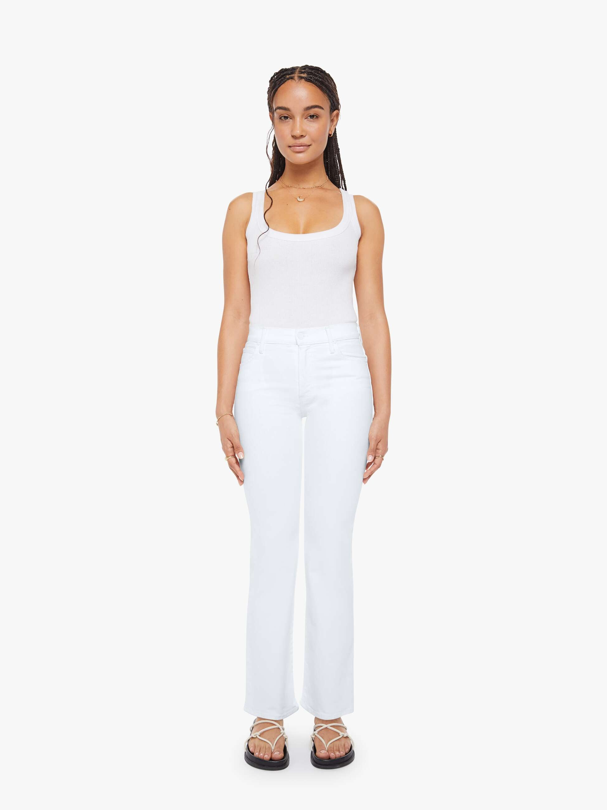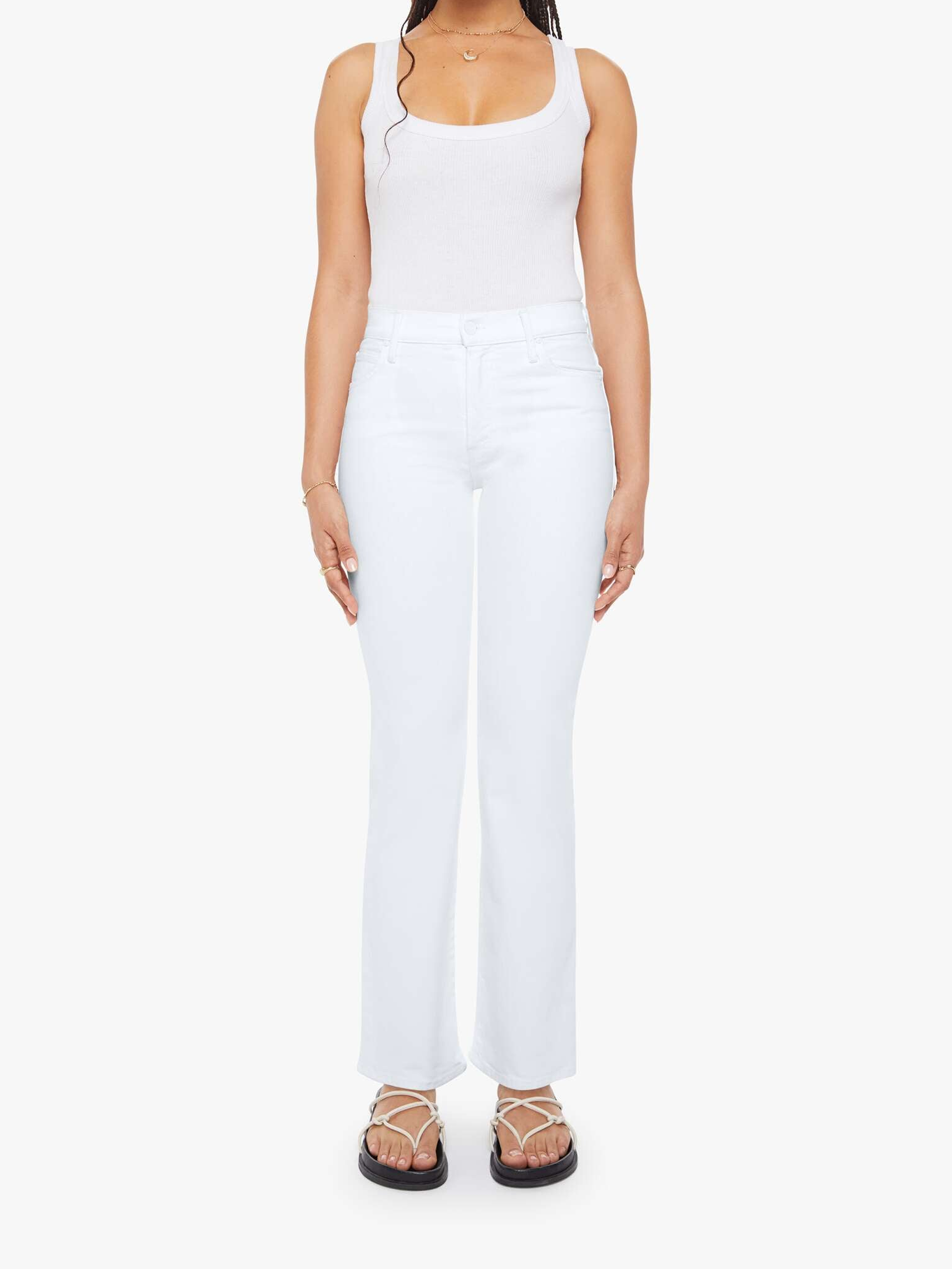 A high-rise straight leg jean with a zip fly, 30-inch inseam and a clean hem. Cut from semi-rigid SUPERIOR denim, Totally Innocent is a classic white with tonal hardware.