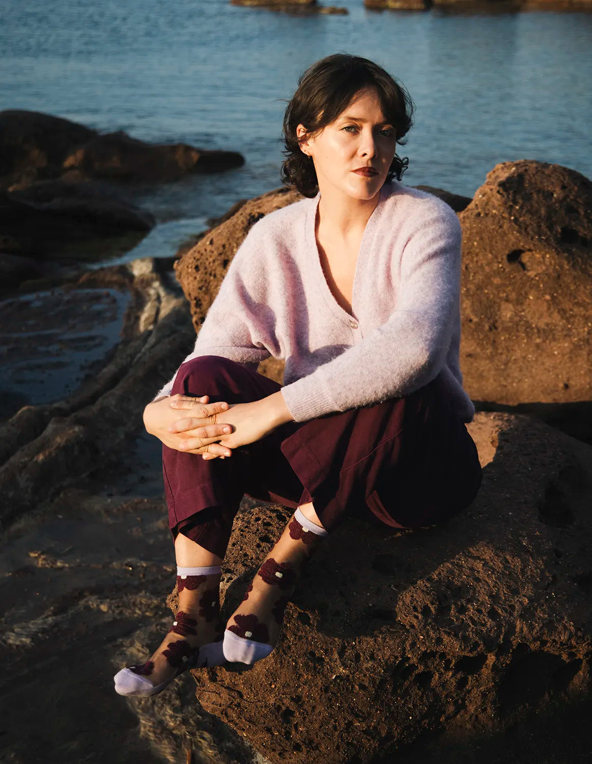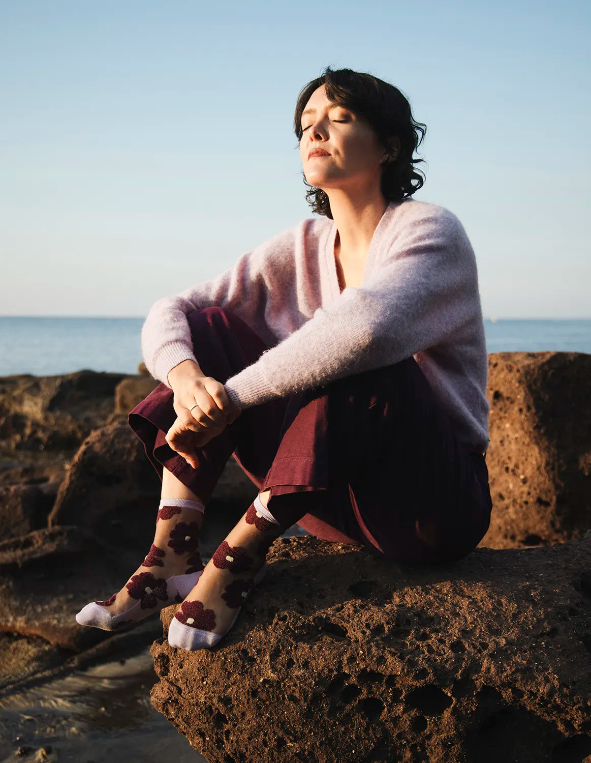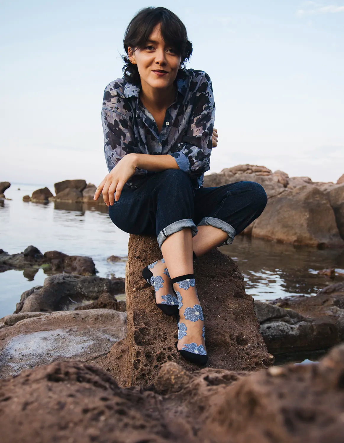 Crescent Dunes Black , a timeless classic. This sober and elegant model is inspired by the solar panels tracking the sun in the heart of Nevada. A sock with black and white polka dots that delicately hug your ankle. Full of chic, it will go wonderfully with loafers and a skirt or black carrot pants.