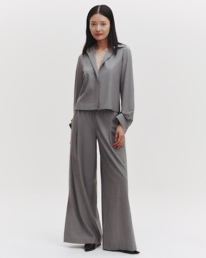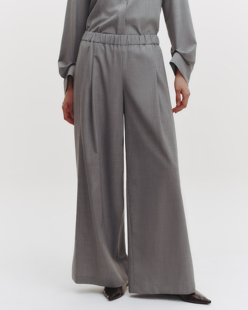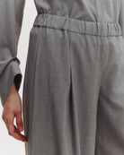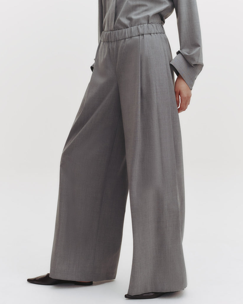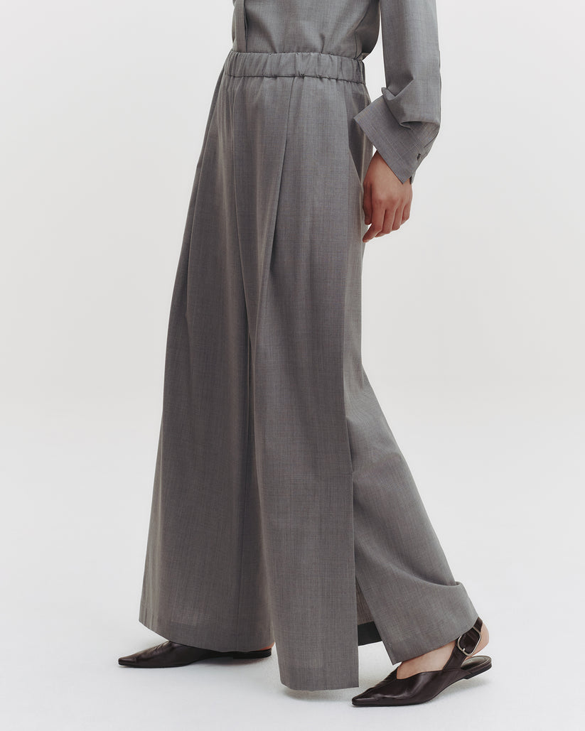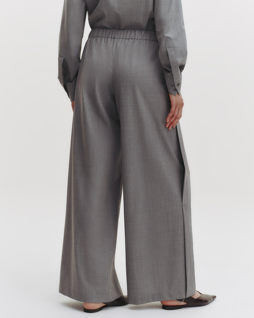 Mid-rise, wide leg pull on pants in ultra-fine stretch suiting. This fabric is a lightweight wool with a touch of elastane for stretch. The Eva pant is a relaxed, loose fitting pant, with inverted pleats down the front and side of the leg. Complete with an elasticated waistband, side pockets and side slit at the hem.