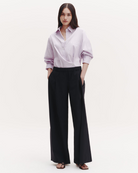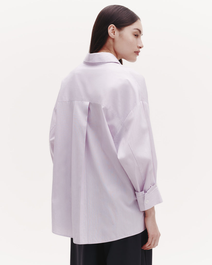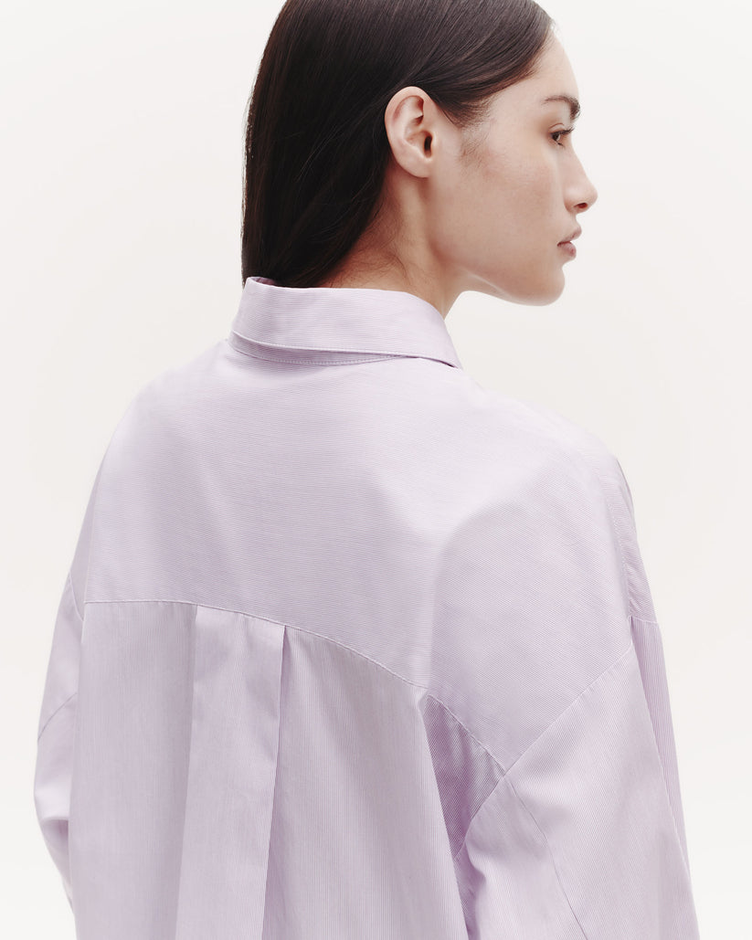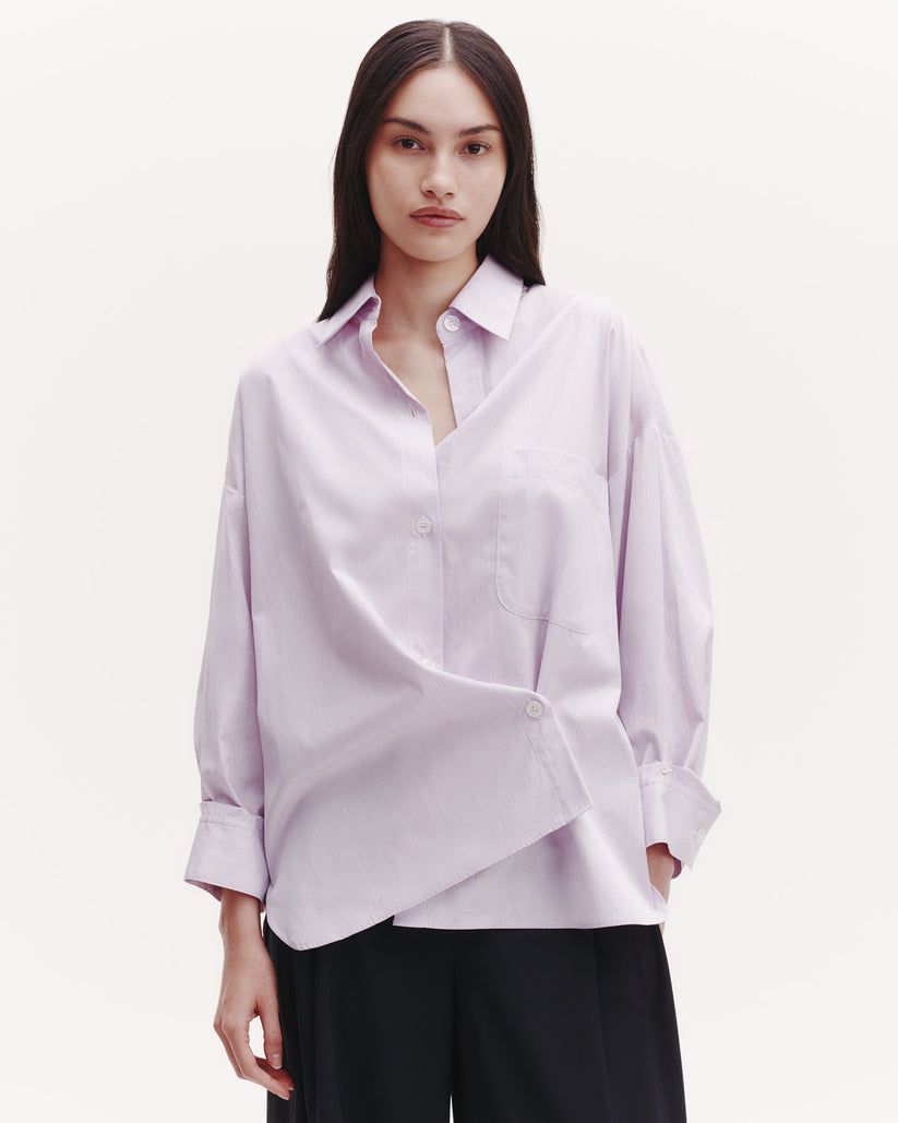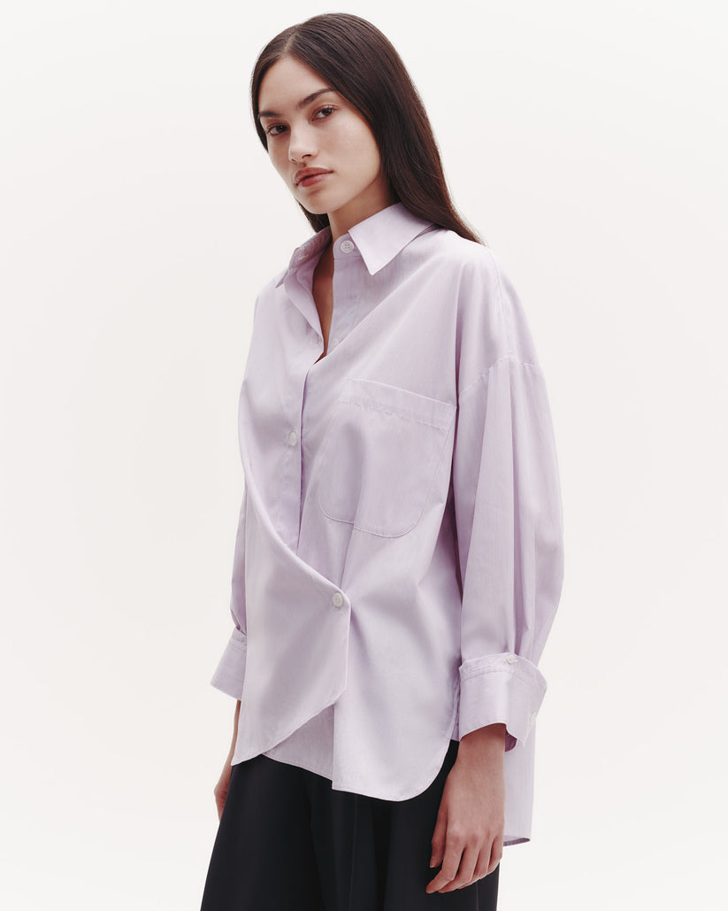 Oversized button down shirt in striped Italian cotton shirting. The Earl is a relaxed shirt featuring an asymmetric button front. Complete with a spread collar, chest patch pocket, back yoke, box pleat at the back, and single roll button cuffs.