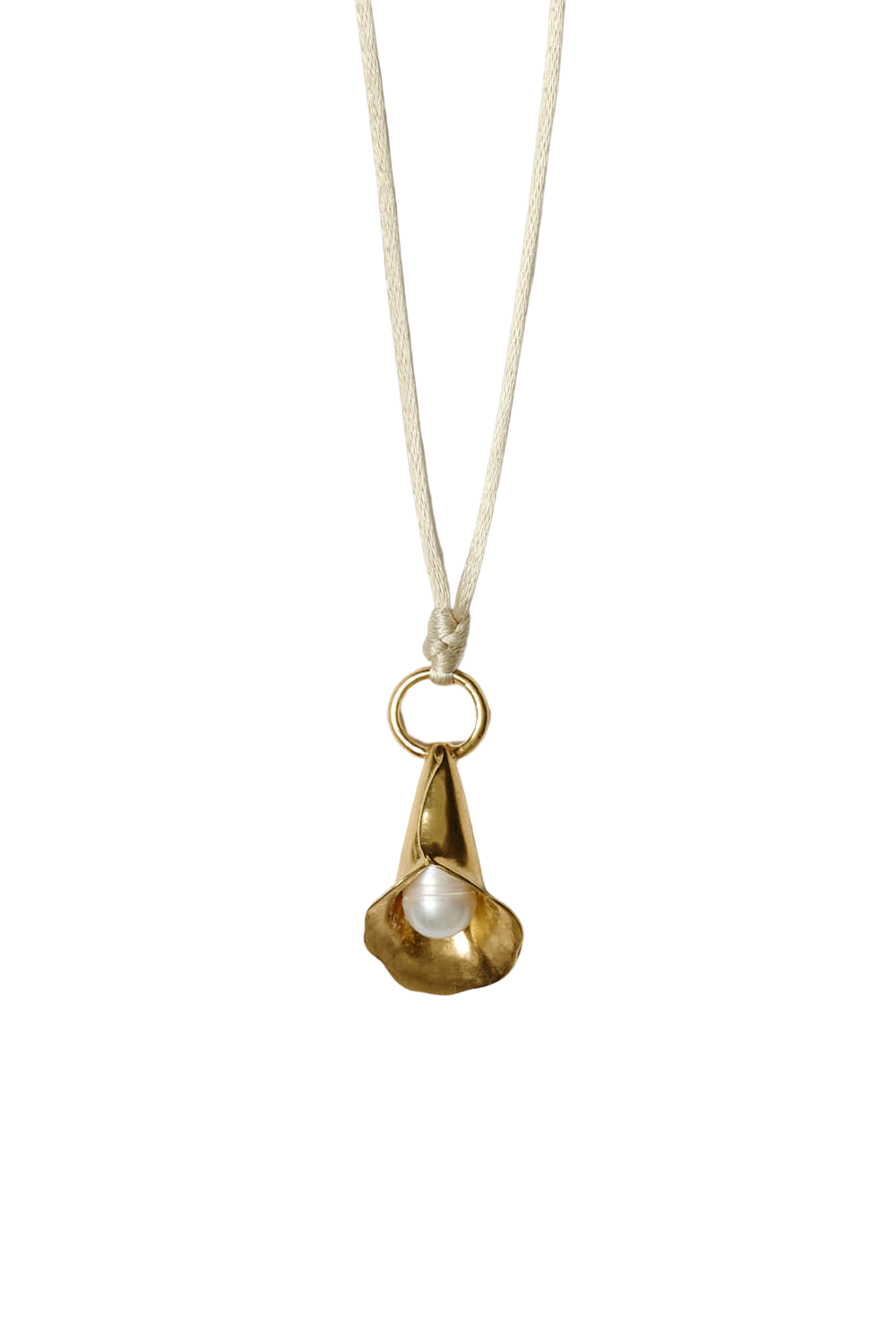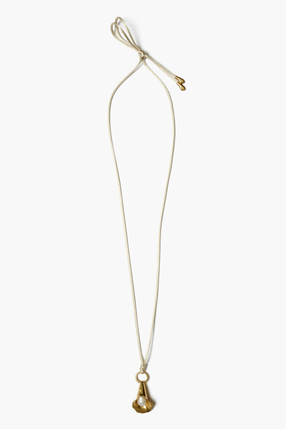 18K gold plated sterling silver necklace featuring calla lily pendant with freshwater pearl drop on satin cording. 40in. length. Adjustable.