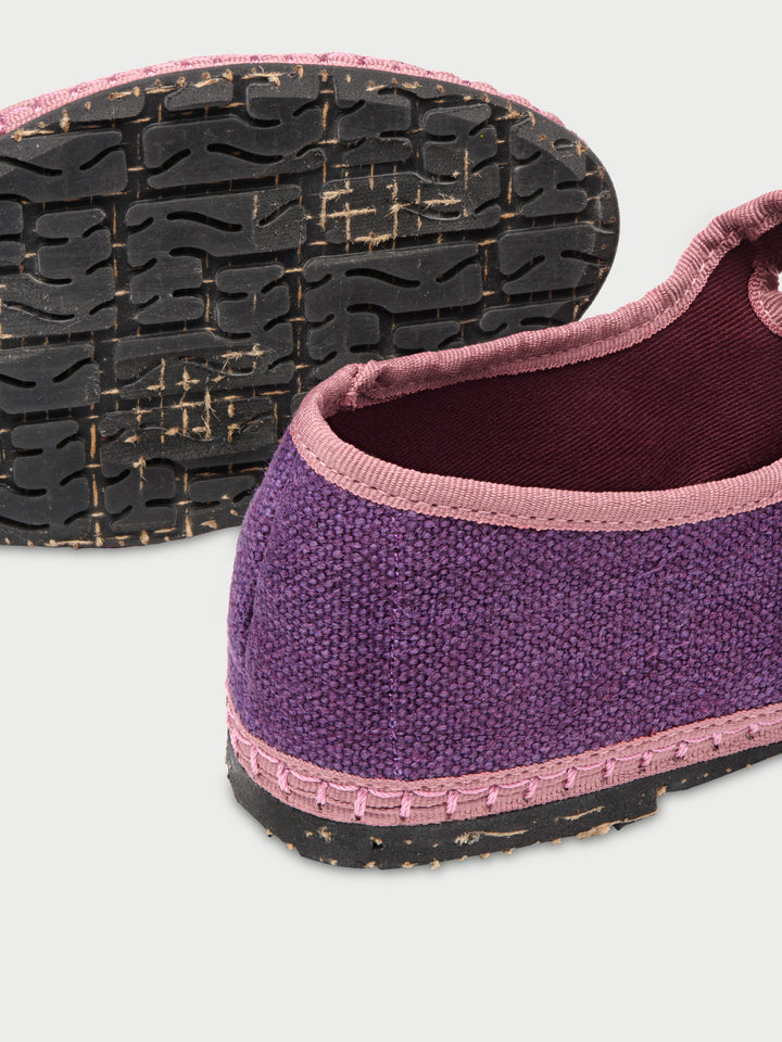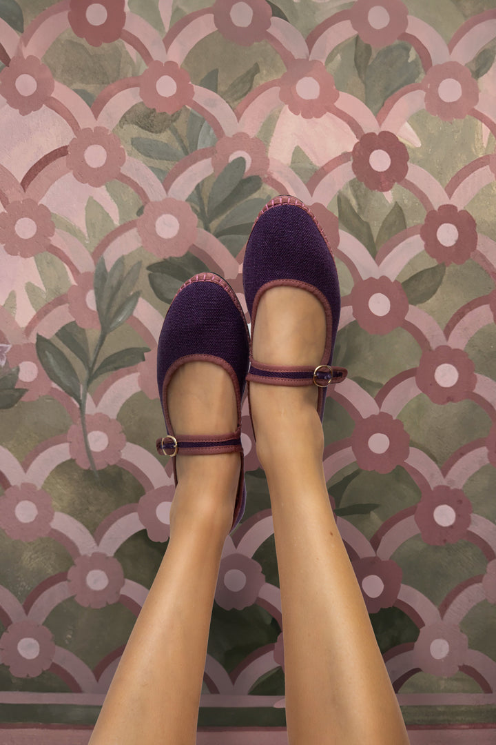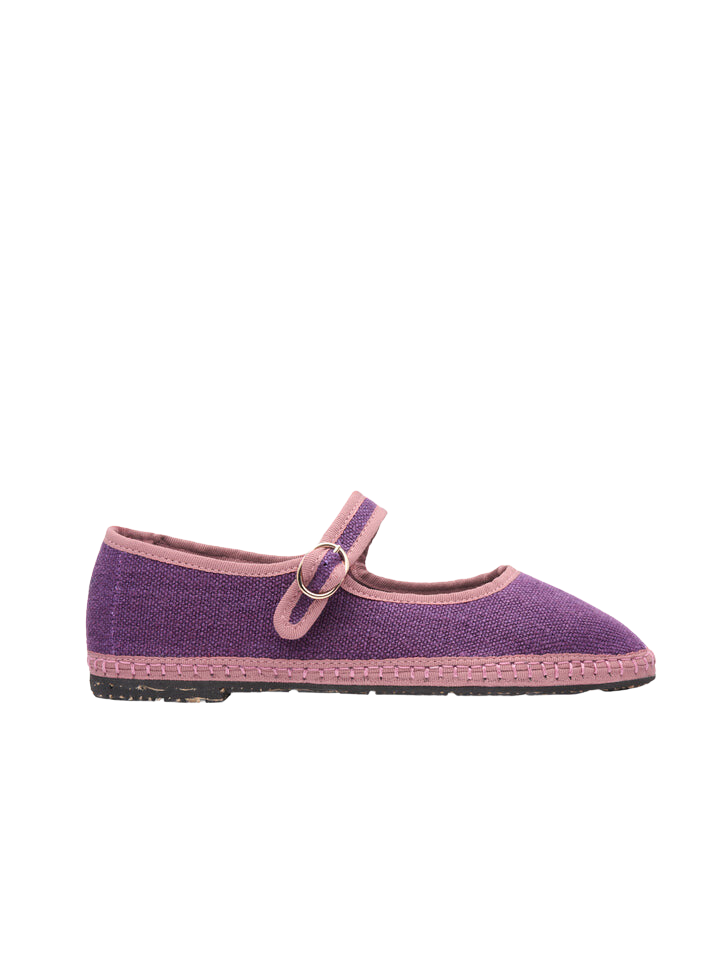 Purple linen mary jane with pale pink piping and buckle closure.