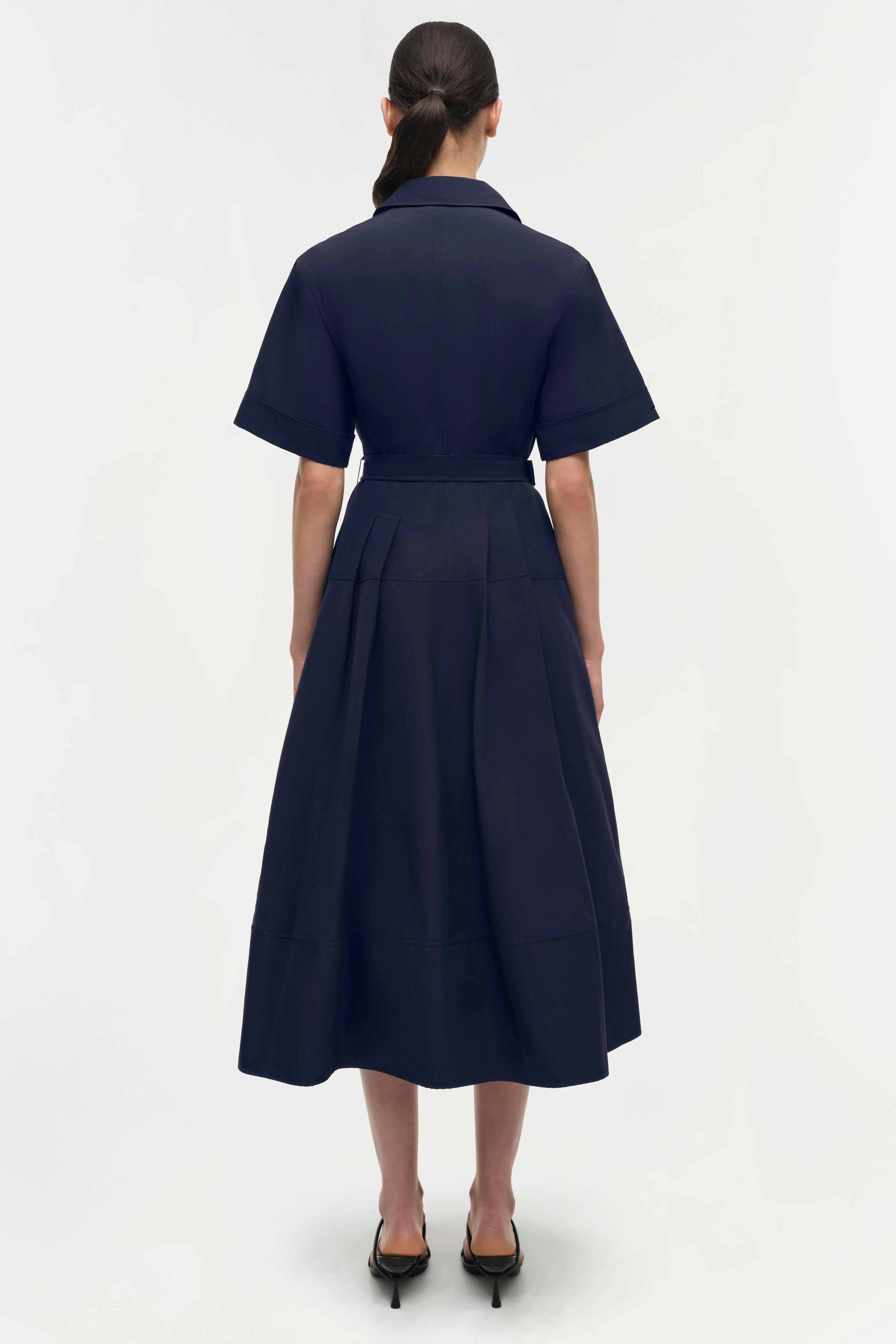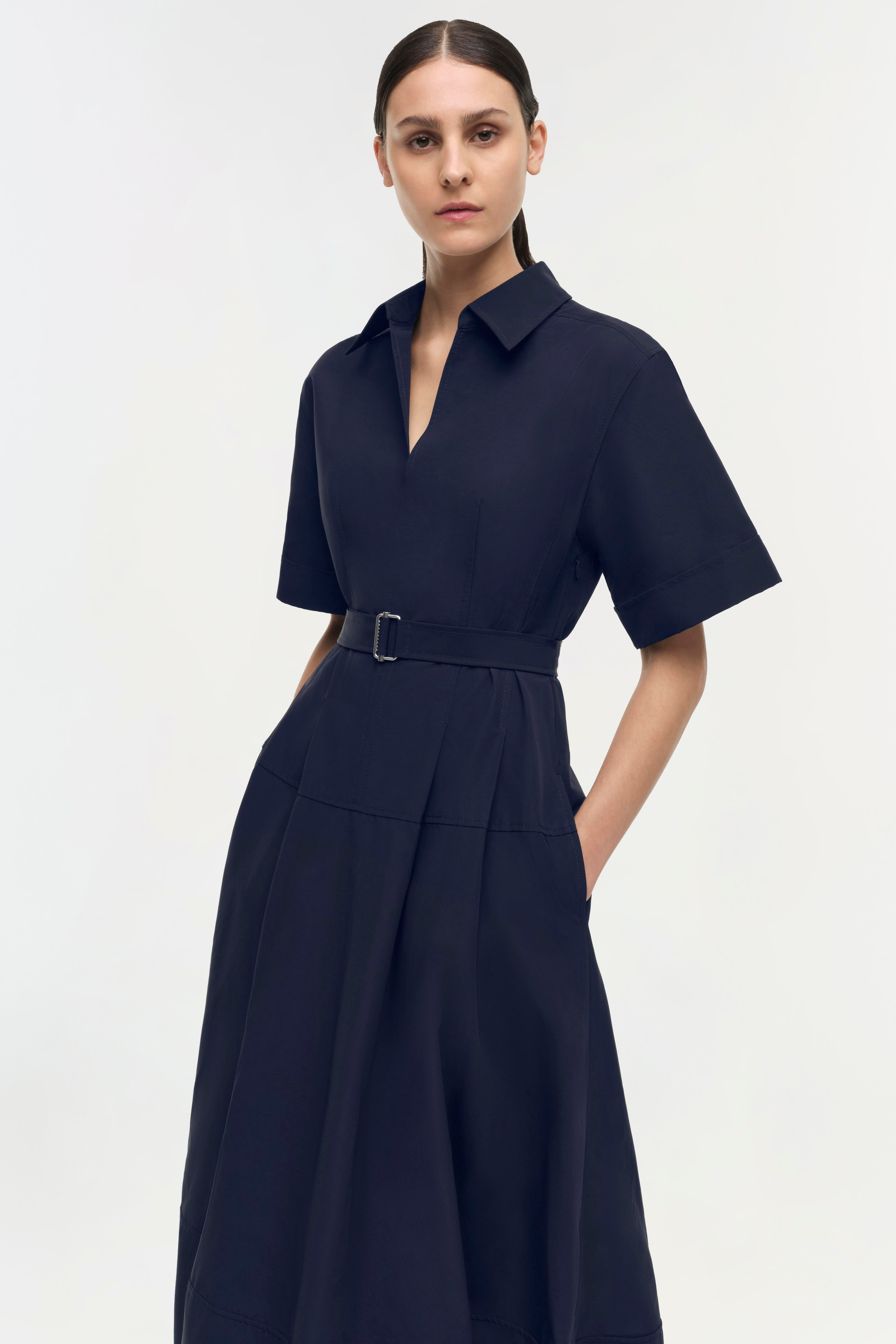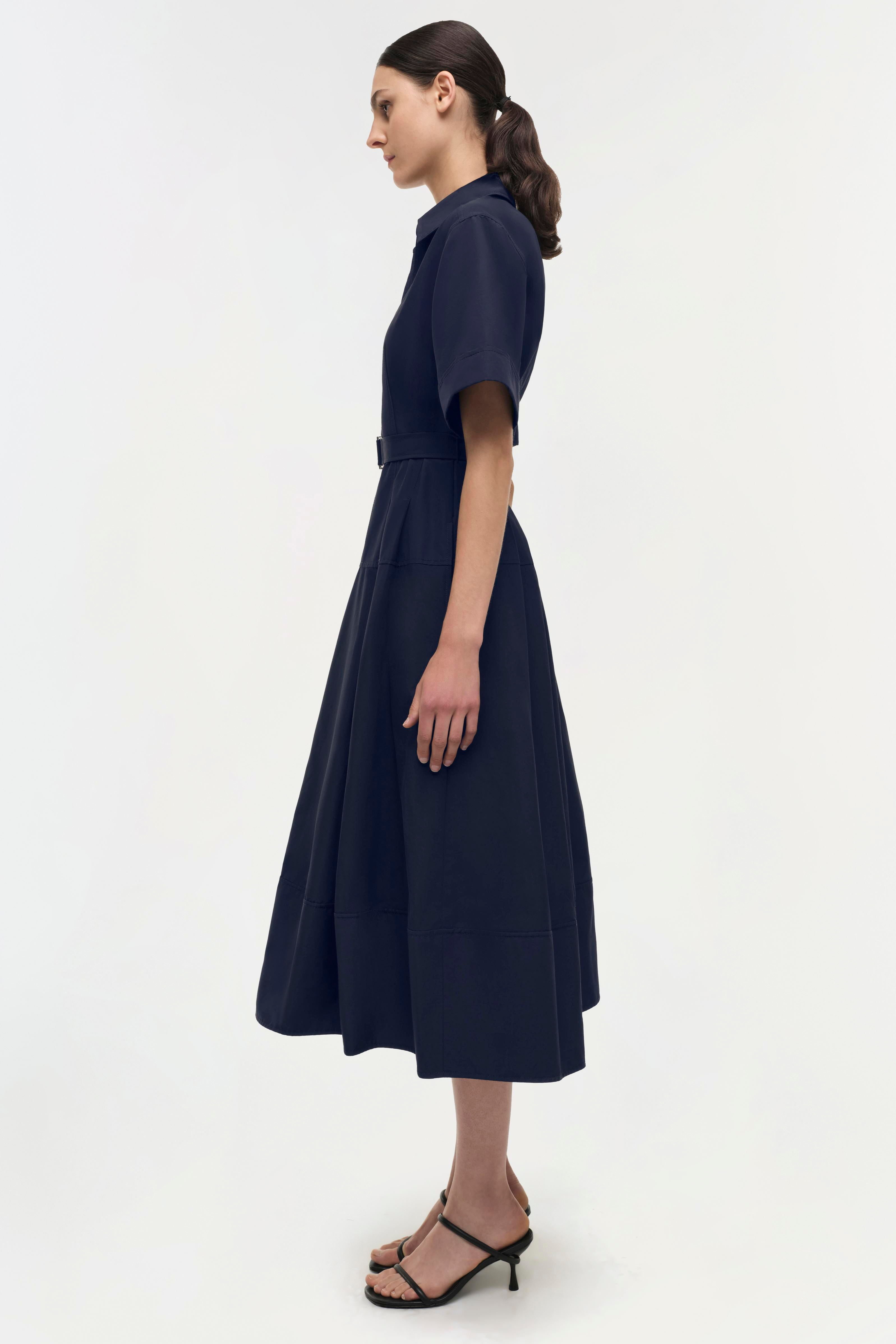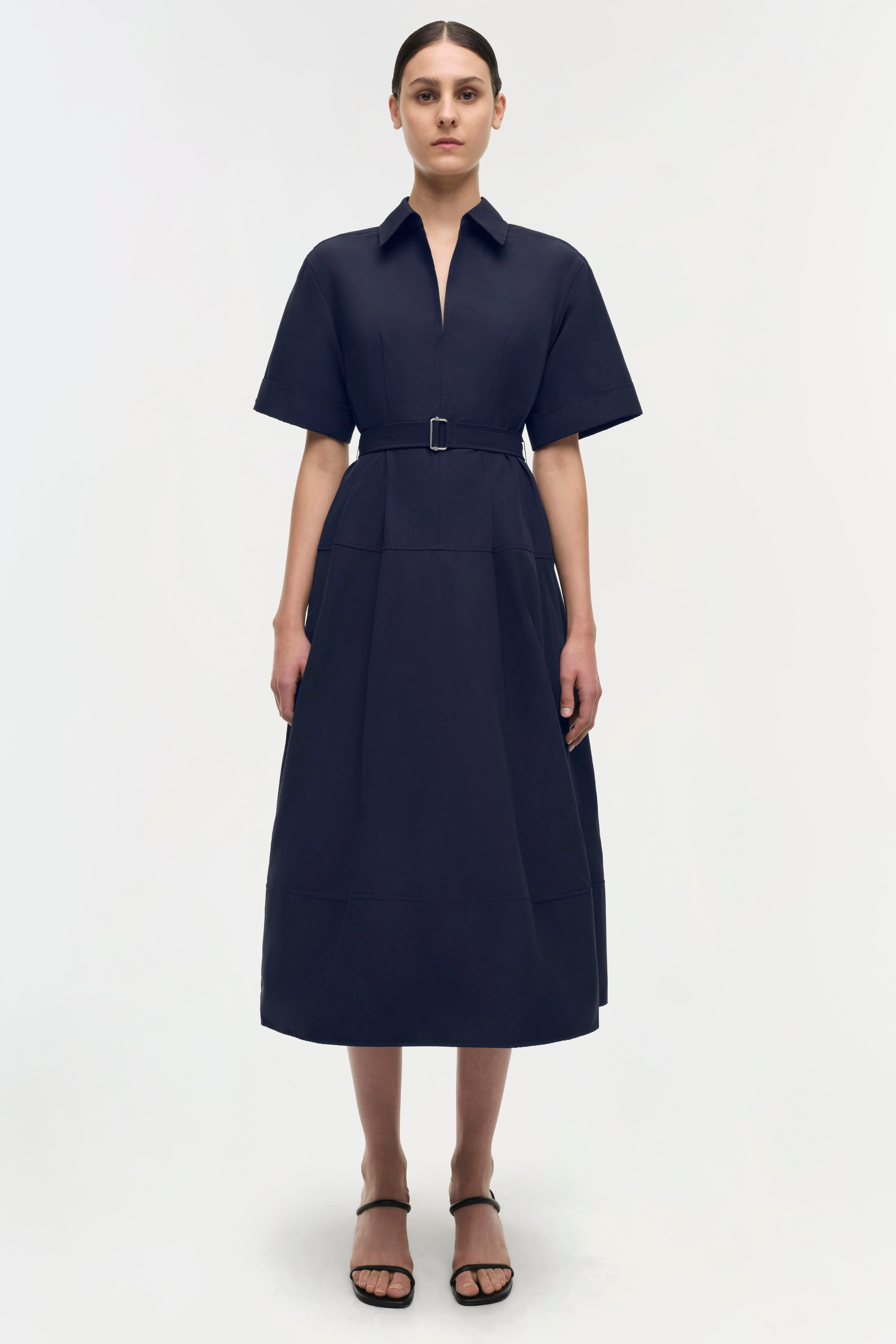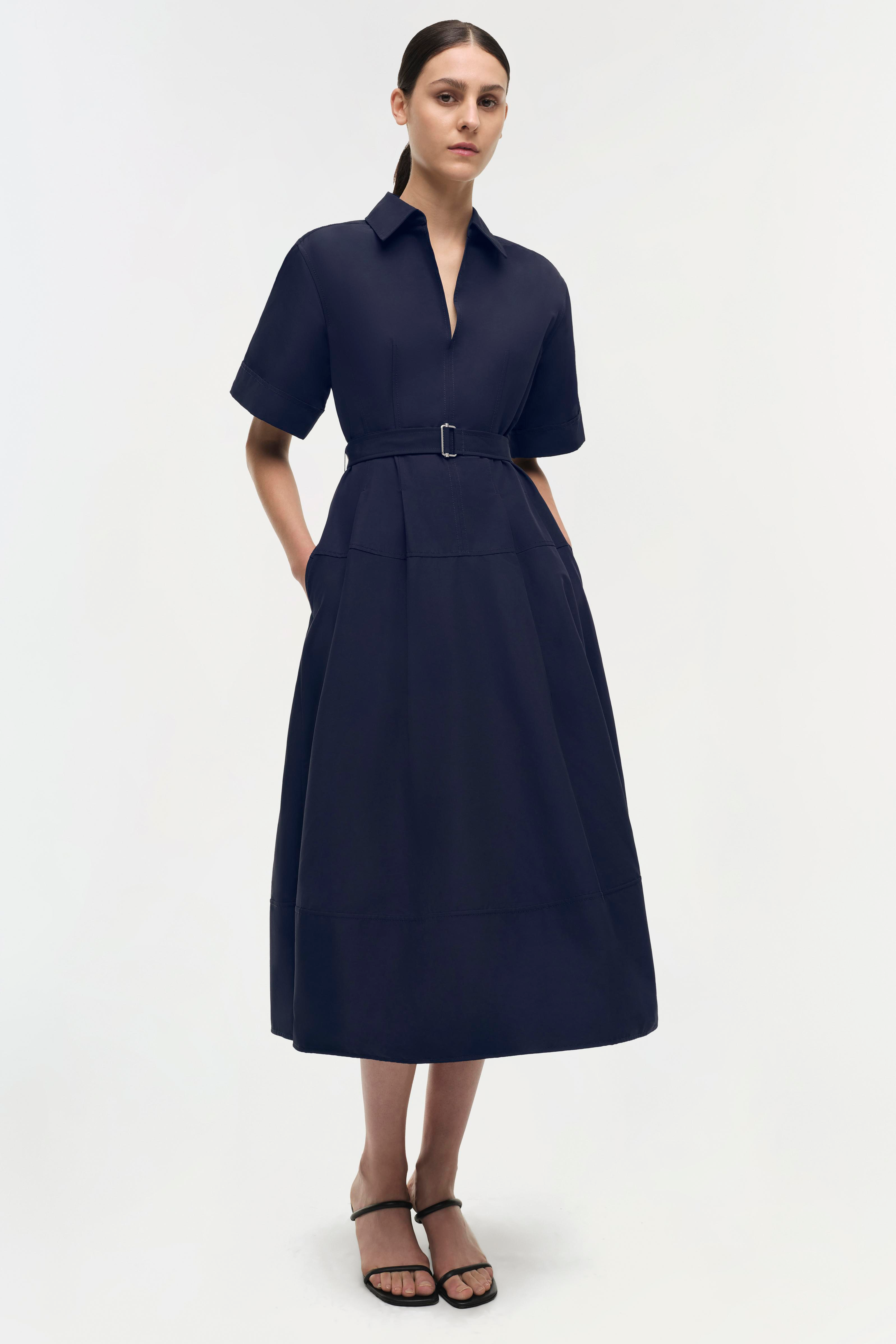 The Deanna Dress in Midnight. Embrace timeless elegance with this navy belted midi. Designed with short sleeves and a crisp collar, it cinches at the waist with a sleek belt, flowing into a flattering A-line silhouette. Perfect for a polished and sophisticated look.